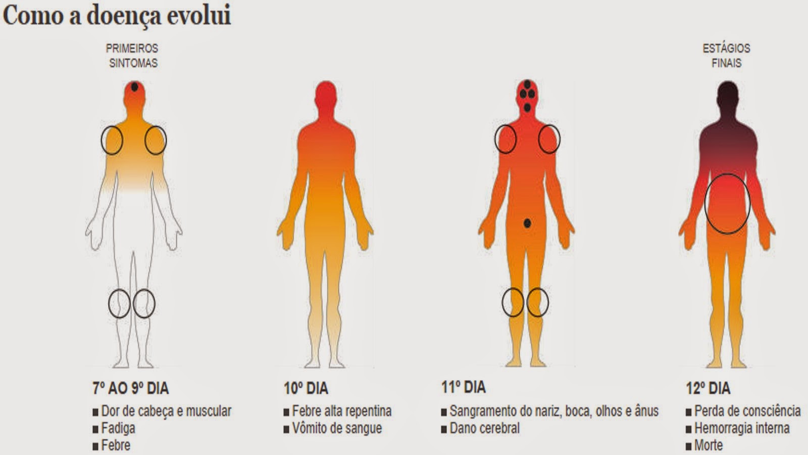 Do 7º ao 9º dia, o paciente apresenta dor de cabeça e muscular, fadiga e febre. No 10º dia, febre alta repentina e vômito de sangue. No 11º dia, sangramento do nariz, boca, olhos e ânus, e dano cerebral. No 12º dia, perda de consciência, hemorragia interna e morte. A maioria dos pacientes morre de hemorragia interna ou com falência múltipla de órgãos.