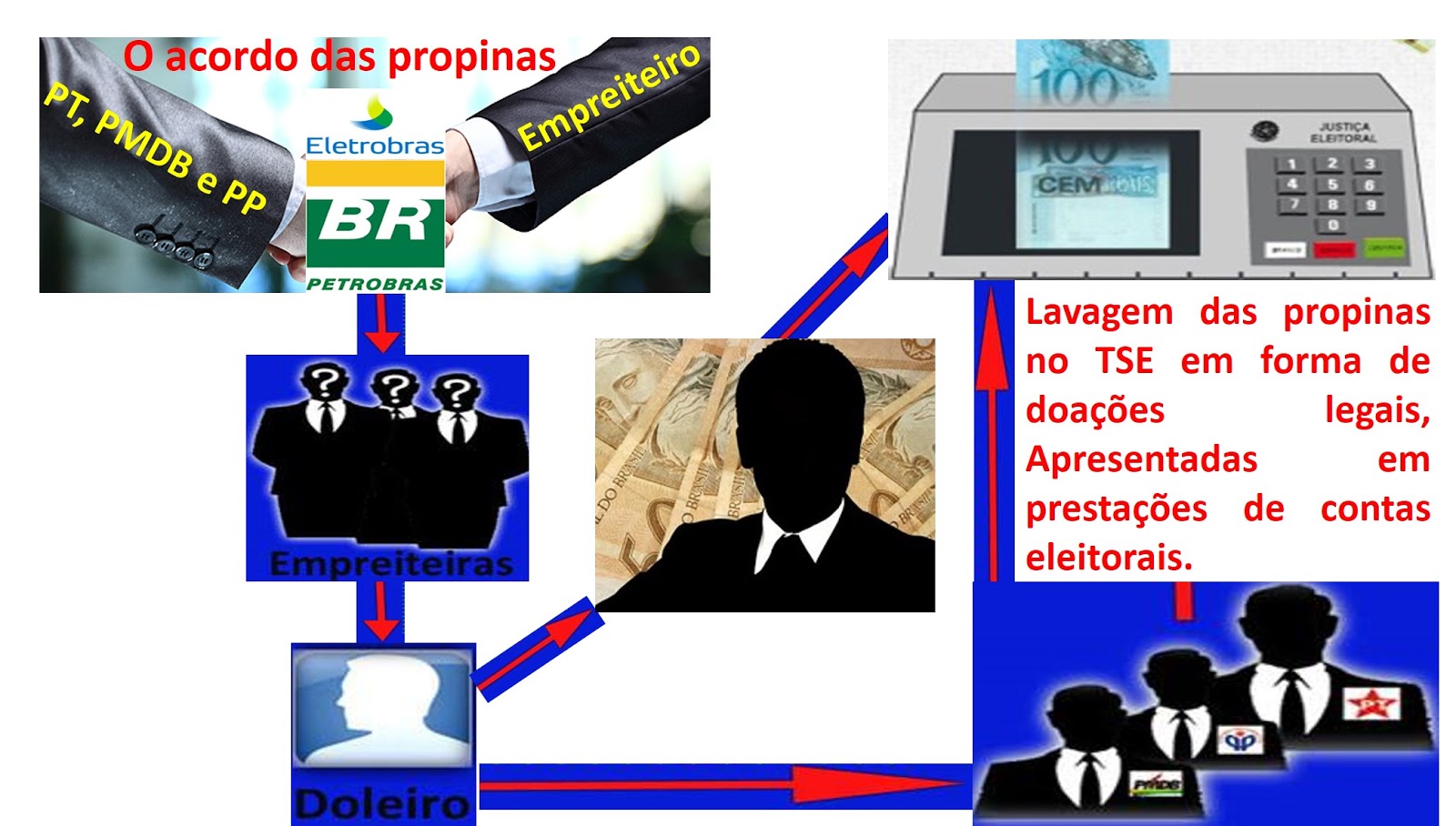 A formação de quadrilha capitaneada pelo PT, PMDB e PP consistiu em abastecer esses partidos e os aliados com recursos desviados da Petrobrás e Eletrobrás, na forma de propinas via doações de campanhas eleitorais.