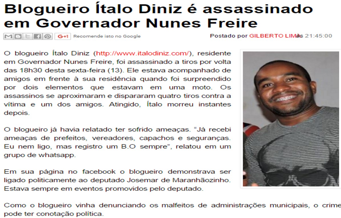 Qualquer que seja a atuação do blogueiro, ele está candidato à morte num Estado em ninguem está seguro e o modus operanti nas execuções é conhecido da polícia: dois pistoleiros em uma moto.