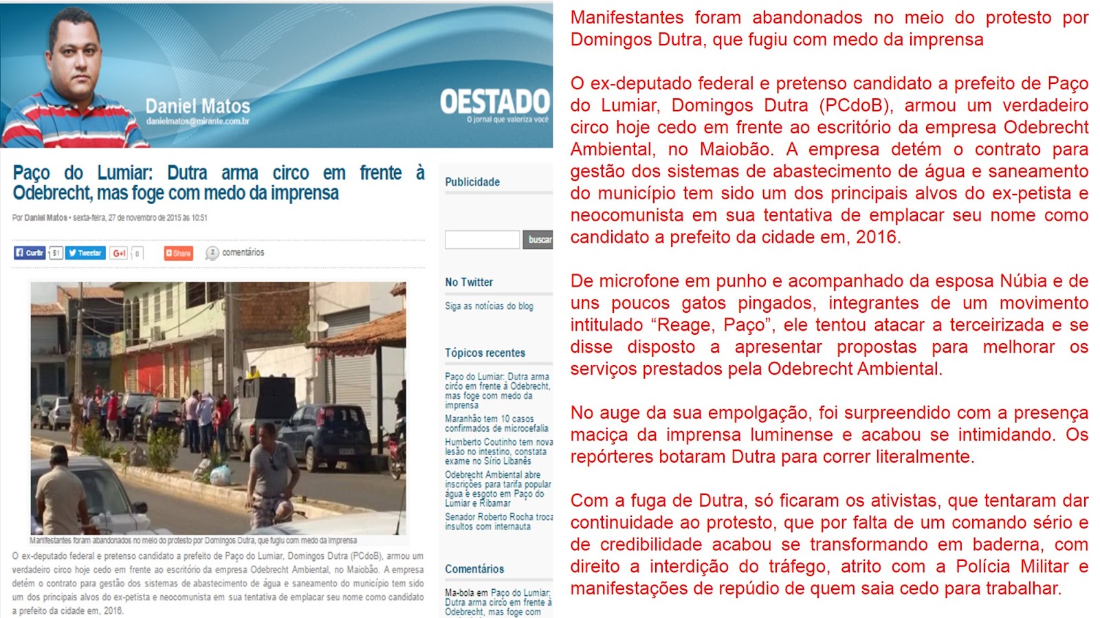 PAÇO DO LUMIAR: Futi foge de protesto com medo da imprensa e da polícia, pois prometeu quebrar a Odebrecht.